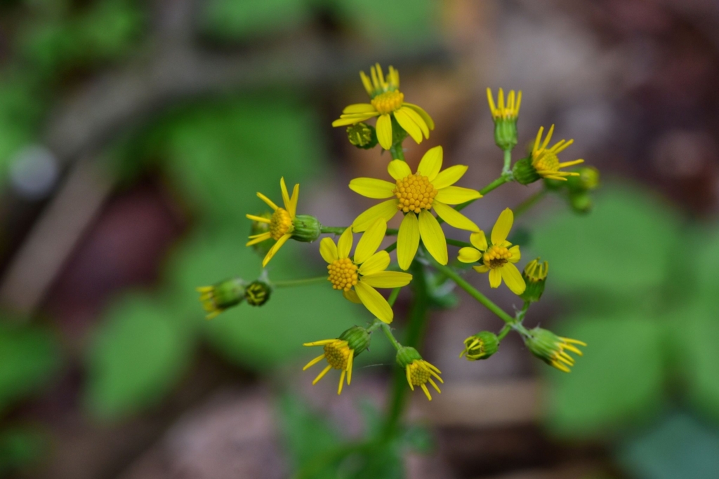 Like other members of the aster family, these “flowers” are actually a composite of eight to 13 ray flowers surrounding a tight cluster of disc flowers. If you happen upon ragwort before the flowers open, you might be surprised to see purple buds that give way to the stunning yellow blooms pictured. Look for colonies of ragworts in shaded woodlands and sunnier areas along trails and roads.