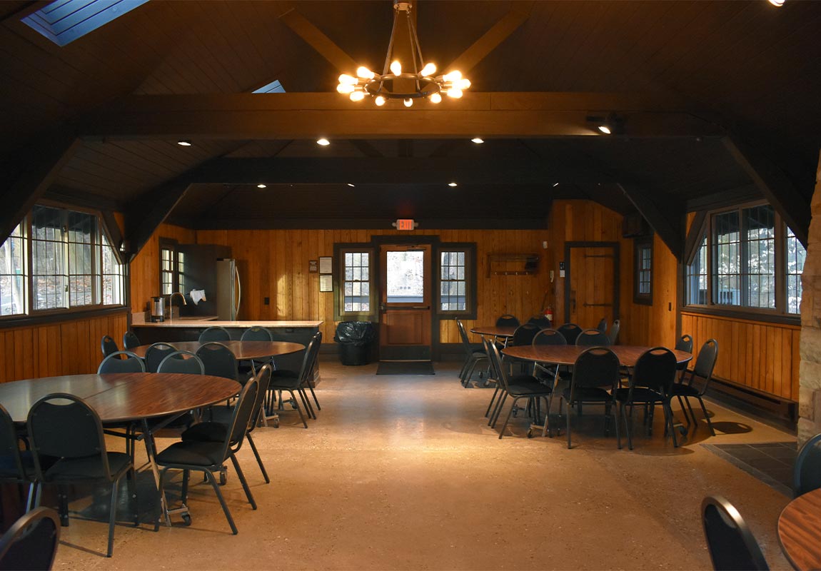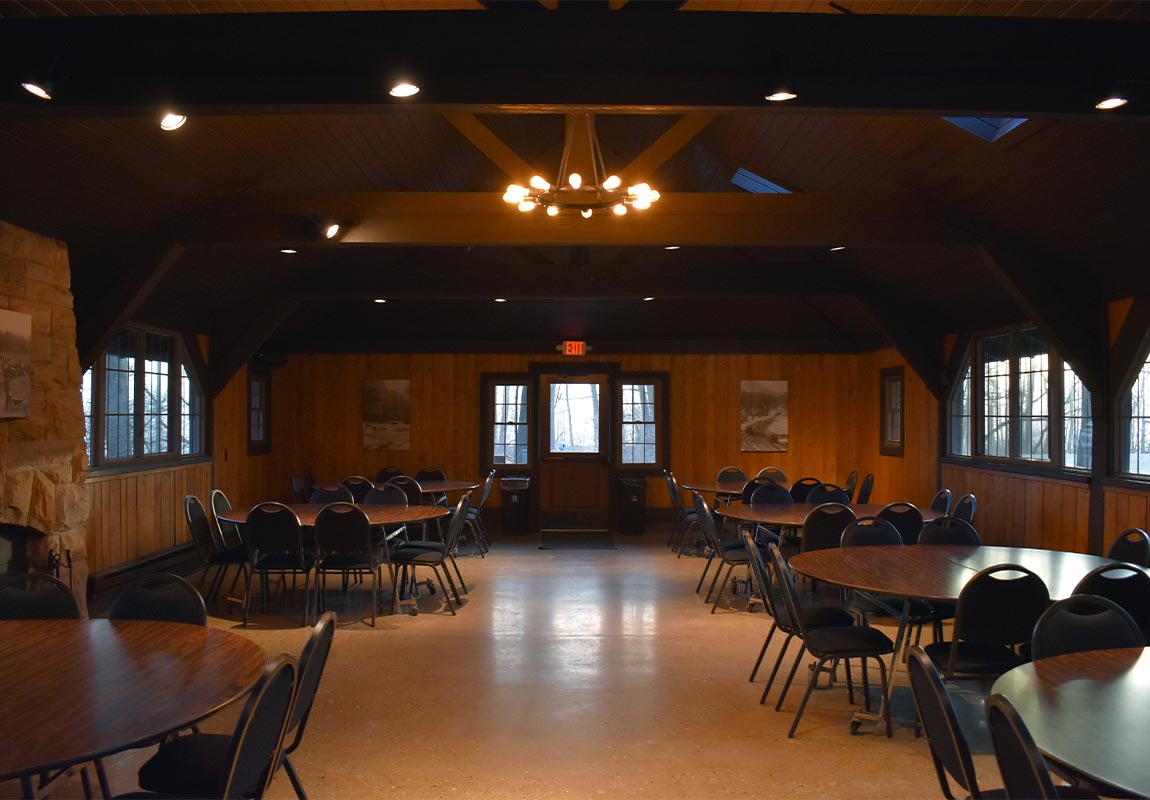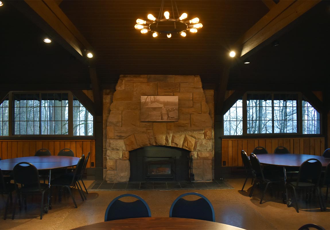 This lodge is a cozy building sheltered by the trees and hills of Sand Run Metro Park.